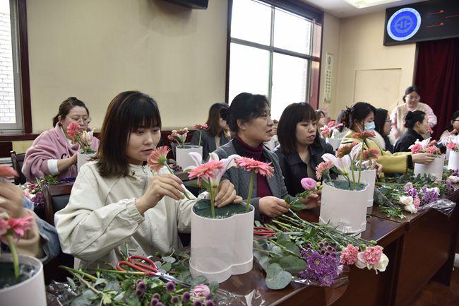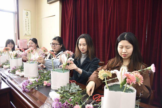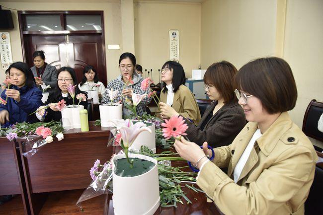 在老师的演示、指导下,大家将玫瑰、小雏菊、康乃馨等花朵进行修枝剪叶,精心搭配,依照顺序错落有致地插在一起,形成了一幅幅独具匠心又饱含深意的插花作品。作品完成后,在场的女同志们纷纷与自己的鲜花作品合影留念,尽情享受着插花艺术的魅力和乐趣。
