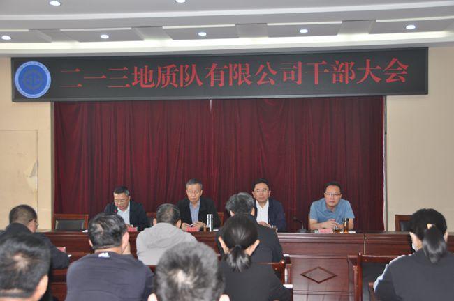 9月25日上午,二一三队有限公司在二楼会议室召开干部大会,宣布队主要领导任免决定。省地勘局党组副书记、副局长、一级巡视员王宏伟,地质集团党委副书记、副董事长杜玉河出席会议。公司领导、中层干部70余人参加会议。大会由姚文兵同志主持。
