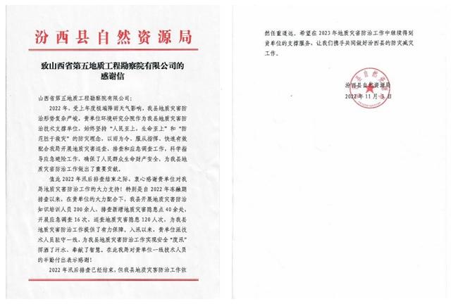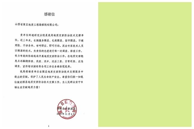 隰县自然资源局感谢信上书:“近三年来,长期服务隰县、扎根隰县、驻守隰县,不避艰险、不讲条件、有呼即应、即可行动。派出专家技术人员以精湛的技术,负责人的态度进行每一次应急调查、排查工作,有力有效的协助我局开展地质灾害防治工作。”