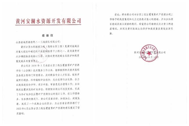 黄河安澜水资源开发有限公司感谢信上书:“贵公司自2018年5月承担古贤工程压覆重要矿产资源评估(山西侧)技术服务工作以来,……在工作困难多,任务重的情况下,贵公司妥善安排、加班加点、成效显著,展现了一个成熟企业的担当,为山西省自然资源厅于2022年6月出具古贤工程压覆重要矿产资源的意见奠定了坚实基础。”