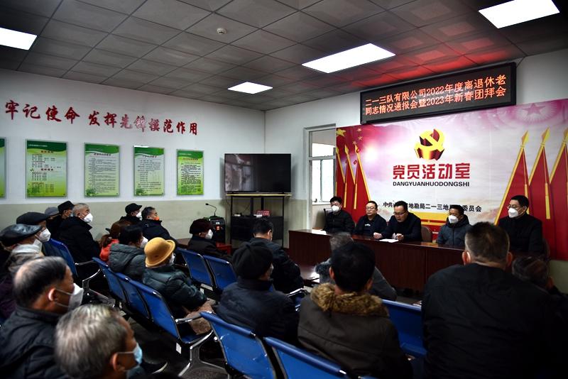 在新春佳节来临之际,1月17日,二一三地质队有限公司召开了离退休老同志情况通报会暨2023年新春团拜会。全体班子成员与离退休老干部、老党员代表欢聚一堂,喜迎新春。公司党委书记、董事长赵江涛主持会议。
