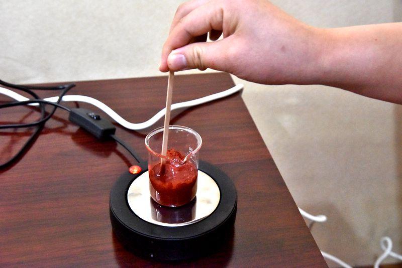 随后,老师介绍了DIY制作口红的方法步骤和注意事项,大家按照老师的讲解,先将精油和色粉按比例装入烧杯混合搅拌,加热融化后倒入模具中冷却,最后通过专业脱模工具将口红取出。搅拌、加热、溶解、固定等一系列步骤过后,大家专属定制的口红就出炉了。大家沉浸在收获的喜悦当中,有的发朋友圈分享努力的成果,有的拍照合影记录美好瞬间,现场气氛轻松而愉悦。
