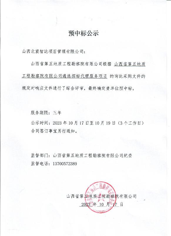 山西省第五地质工程勘察院有限公司遴选招标代理服务项目预中标公示