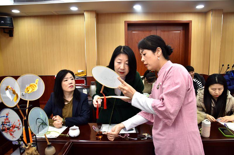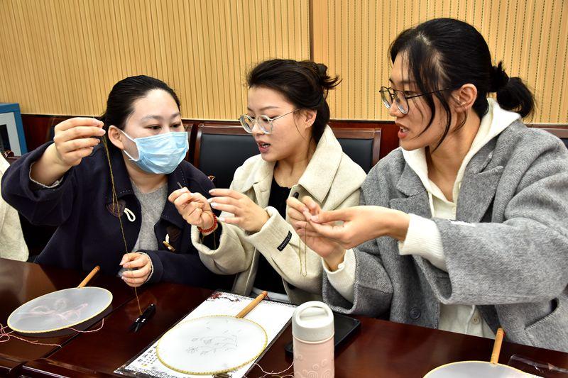一针一线勾勒出人物花鸟,经纬之间绣出锦绣山河。活动现场,尧都区非物质文化遗产中心的平水绣老师将所带工具一字排开,一个个精巧的团扇瞬间吸睛,一团团色彩亮丽的绣线也让人爱不释手,女职工们也按耐不住好奇之心,跃跃欲试。