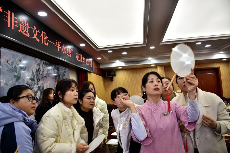 老师们从平水绣的历史与文化娓娓道来,结合勾线、手法以及106种针法等技巧,将这项非遗技艺的魅力淋漓展现。“老师,我的手怎么不听使唤?”“老师,这边勾线多了一截怎么修补?”老师教得认真,女职工们也学得仔细。