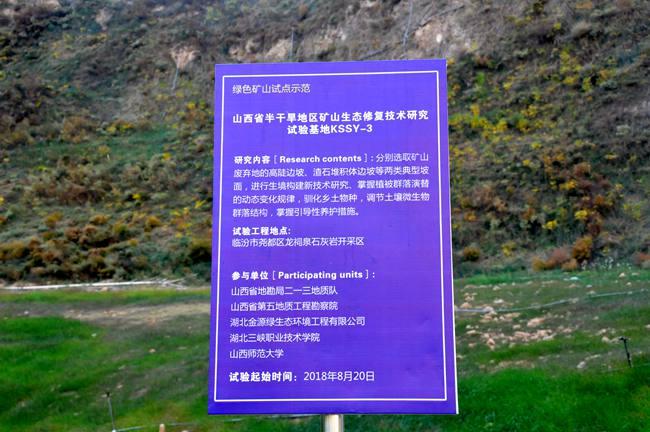 2018年8月20日,我队与湖北三峡职业技术学院、湖北金源绿通生态环境工程有限公司、山西师范大学共同出资共建矿山师范基地,对龙祠泉地质灾害环境修复治理项目中遗留的石渣边坡开展生态恢复试验,此次试验采用的技术是在渣土坡喷射Ecoflex生境基材(可生物降解新型材料)、土以及种子等生物培育料。经过两个多月的试验,该生态修复新技术研究应用取得良的好治理实效。
