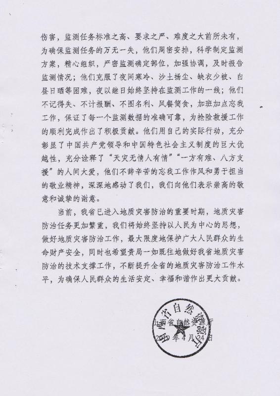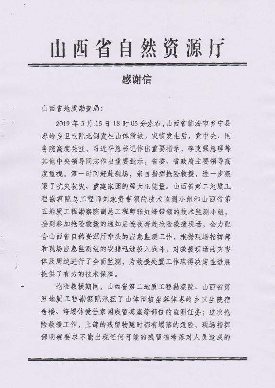 2019年4月24日,山西省自然资源厅给山西省地质勘查局发来感谢信,对我队在山西省临汾市乡宁县枣岭乡“3.15”山体滑坡灾害救援作出的贡献表示感谢。