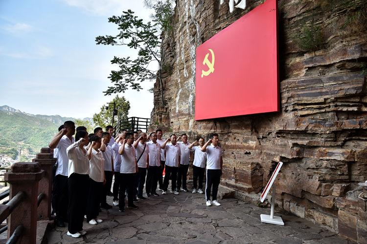 “我志愿加入中国共产党,拥护党的纲领,遵守党的章程……”全体党员面对鲜红的党旗庄严地举起右手,重温入党誓词,牢记初心使命,砥砺奋发前行。入党誓词激荡着红旗渠水,回响在太行山间。