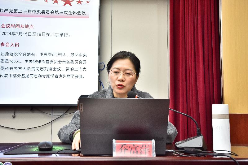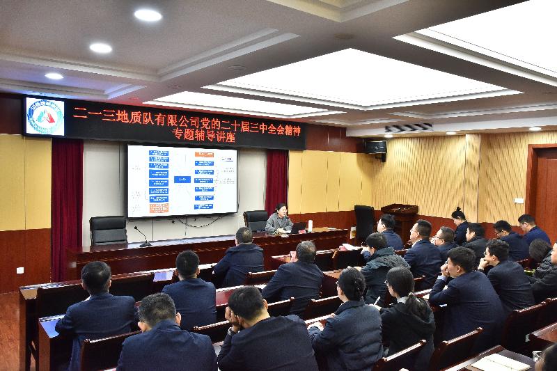 为深入学习贯彻习近平总书记在党的二十届三中全会上的重要讲话精神和全会精神,11月25日,二一三地质队有限公司举办党的二十届三中全会精神专题辅导讲座。特邀临汾市委讲师团理论研究室主任乔富萍授课。公司党委副书记、副董事长、总经理马亮主持会议并讲话。在司党委班子成员、党员干部共计50余人参加辅导讲座。