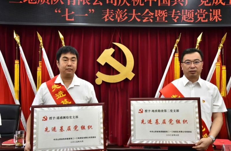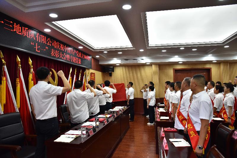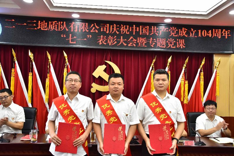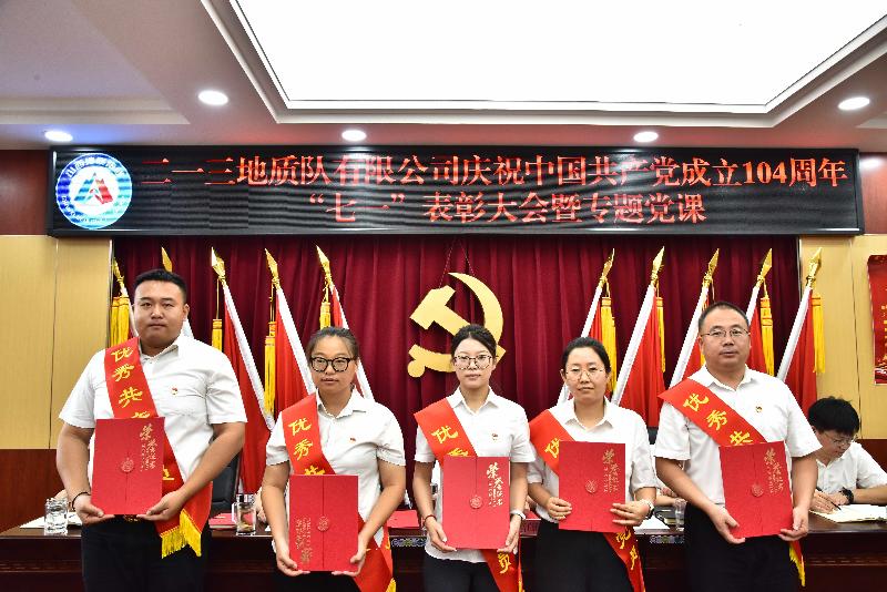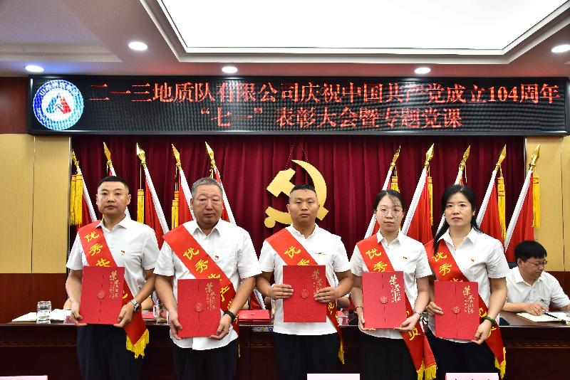 在中国共产党成立104周年即将到来之际,为推动深入贯彻中央八项规定精神学习教育走深走实,激励广大党员干部坚定理想信念、永葆对党忠诚的政治本色,6月30日,二一三地质队有限公司召开庆祝中国共产党成立104周年“七一”表彰大会暨专题党课。公司党委书记、董事长赵江涛讲授专题党课。公司党委专职副书记、副董事长、工会主席乔俊卿主持会议。公司其他班子成员、在职党员干部共50余人参加会议。