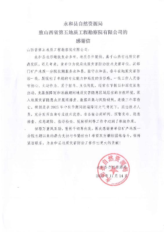 11月14日,山西省第五地质工程勘察院有限公司收到永和县自然资源局发来的感谢信,对公司长期以来在永和县地质灾害防治工作中给予的专业技术支撑和辛勤付出表示衷心感谢,高度肯定了公司地灾防治支撑服务团队“守初心、敢担当、无惧险”的责任担当与专业素养。