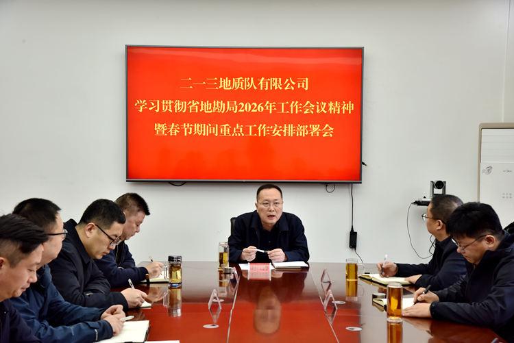 2月12日下午,二一三队有限公司召开学习贯彻省地勘局2026年工作会议精神暨春节期间重点工作安排部署会。公司党委书记、董事长赵江涛主持会议并讲话,公司领导班子成员、各经营单位、管理部门负责人参加会议。