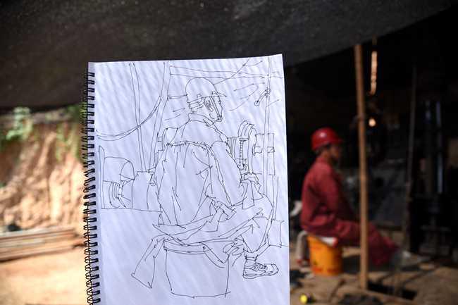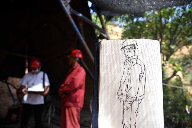 骄阳似火,热浪袭人。采风第一站来到了襄汾县李家庄金矿普查项目的钻机工地,一到施工现场,艺术家们就被眼前挥汗如雨的劳动场面和井然有序的生产流程所吸引,激发了创作热情,用手中的画笔和相机记录下钻机工人战高温、斗酷暑,奋力拼搏、艰苦奋斗的一幕幕场景。