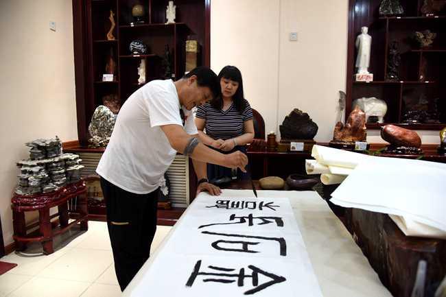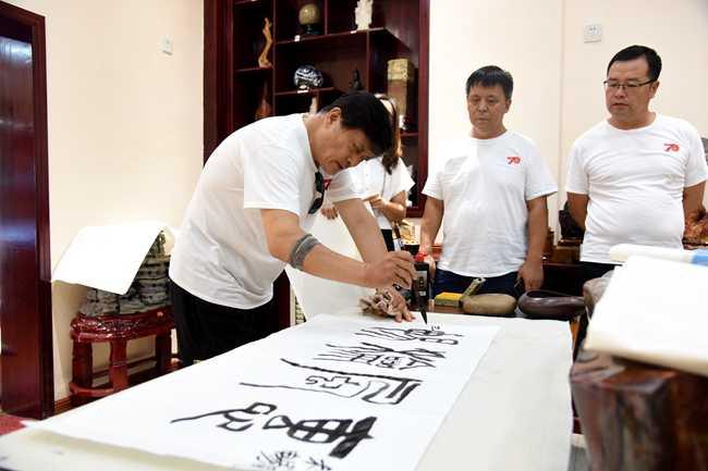 最后,艺术家们参观了二一三奇石博物馆,对馆内收藏的290余种的奇石、古生物化石、珠宝玉石等进行鉴赏、拍摄。二一三奇石博物馆作为地质文化名片,免费向社会公众科普地质科学,宣扬地质文化、玉石文化、奇石文化,为繁荣当地文化事业,提高人民群众的精神文化生活作出了积极贡献。在良好的创作氛围中,原山西美术家协会副主席孙海青老师为奇石博物馆题字留念“金石长寿”“惠风和畅”,本次采风活动圆满结束。