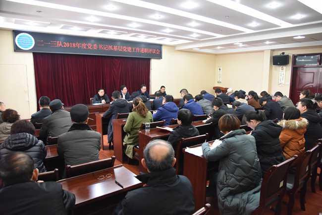 根据局、队党委统一安排,12月24日下午,二一三队在二楼大会议室召开了2018年度党委书记抓基层党建工作述职评议会议。队党委委员、队属各党支部书记和支委、队第九次党代会代表共50余人参加了会议,队长杜玉河主持。