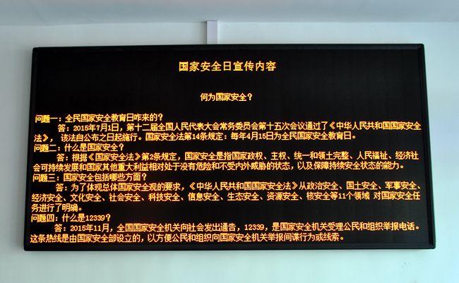 我队通过在办公楼公示栏张贴宣传资料、电子显示屏滚动播放宣传标语和图片等多种形式,从“何为国家安全”“危害国家安全的行为及相关罪名”“如何维护国家安全行为”三个方面进行普及宣传。同时,利用微信平台向全队干部职工推送相关法律知识。
