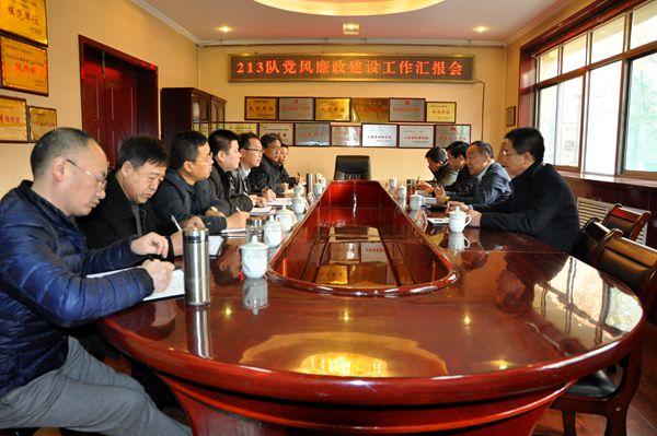 会上,郭英杰组长首先介绍此次调研工作的目的、意义和要求;接着听取了党委副书记赵江涛作的213队党风廉政建设等工作情况的汇报;其次对参会队班子成员提出了有关对主体责任的认识、“四种形态”的落实、“四风”查处以及党风廉政建设中遇到的困难、困惑、矛盾等问题,在听完汇报后,郭英杰组长做了耐心的分析和解答。