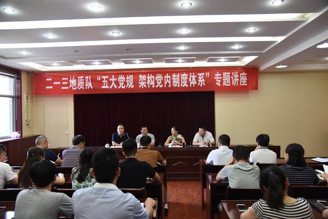 在建党96周年到来之际、在全队开展维护核心、见诸行动主题教育和推进“两学一做”学习教育常态化制度化期间,二一三队于6月20日下午在二楼大会议室举办了“五大党规架构党内制度体系”专题讲座,特邀临汾市尧都区纪委常委、监委会委员乔文耀和尧都区委宣传部副部长秦英前来授课,队领导、全队副科级以上中层干部、在职党员60余人聆听了讲座,讲座由队党委副书记赵江涛主持。