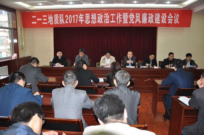 3月31日,二一三队在二楼大会议室召开2017年思想政治工作暨党风廉政建设会议,队领导、机关各科室负责人、二级实体负责人、各党支部书记共50余人参加了会议,队长杜玉河主持会议。