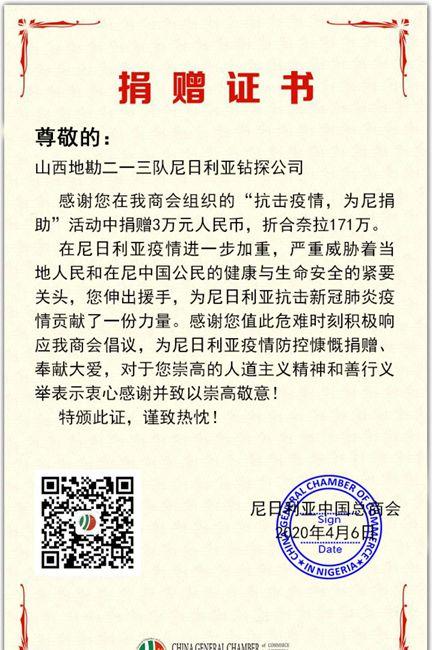 近日,213队尼日利亚钻探公司收到尼政府部门和驻尼中国总商会的抗疫捐赠感谢信。感谢213队尼日利亚钻探公司一如既往地支持尼日利亚人民,为尼抗击新冠疫情做出了积极表率和贡献。
