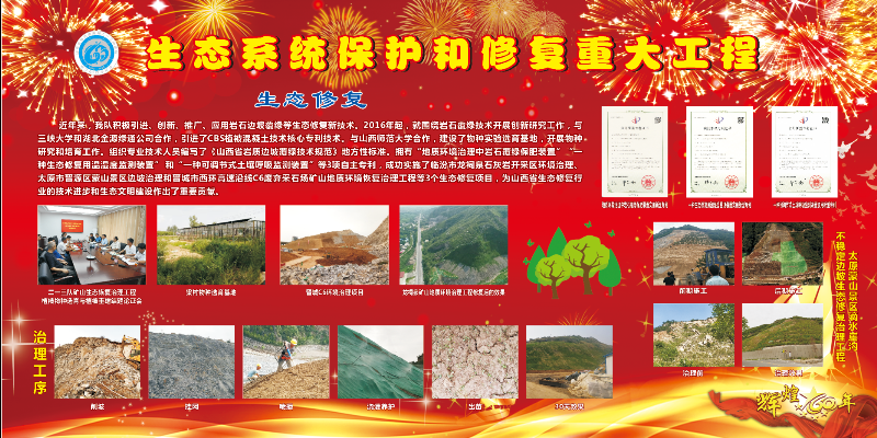 自2016年起,我队就围绕岩石覆绿技术开展创新研究工作,与三峡大学和湖北金源绿通公司合作,引进了CBS植被混凝土技术核心专利技术。与山西师范大学合作,建设了物种实验选育基地,开展物种研究和培育工作。组织专业技术人员编写了《山西省岩质边坡覆绿技术规范》地方性标准。拥有“生态修复用温湿度监测装置”和“地质环境治理中岩石覆绿保肥装置”等2项自主专利,成功实施了临汾市龙祠泉石灰岩开采区环境治理、太原市晋源区蒙山景区边坡治理和晋城市西环高速沿线C6废弃采石场矿山地质环境恢复治理工程等3个岩石覆绿项目,开创了干旱半干旱气候条件下生态治理的新途径,为山西省生态修复行业的技术进步和生态文明建设作出了重要贡献。