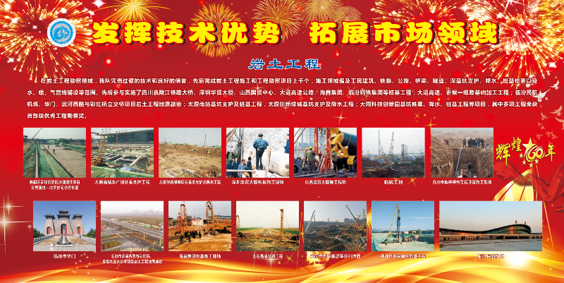 在岩土工程勘察领域,我队凭借过硬的技术和良好的信誉,先后完成岩土工程施工和工程勘察项目数百个,参与实施了嘉陵江铁路大桥、深圳华贸大厦、山西国贸中心、大运高速公路、海鑫基团、临汾钢铁集团等桩基工程;大运高速、霍候一级路基础加工工程;临汾民航机场、山西中南部货运道路、临汾市华门岩土工程勘察;太原南站基坑支护、桩基工程,太原创新绿城基坑支护及降水工程;大同科技创新园基坑帷幕、降水、桩基工程等项目。